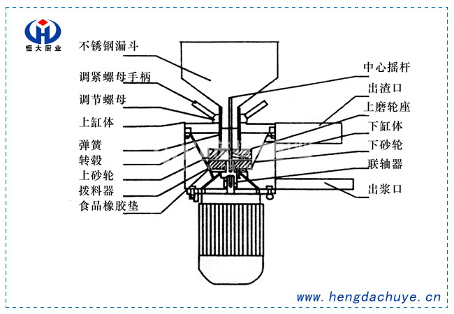 1、將磨漿機上的料斗拿開,松開磨漿機反搭扣,打開磨蓋撿查上下砂輪是否上緊。